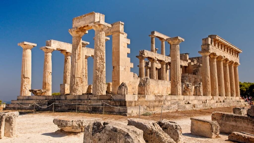 The most famous is the sanctuary of Aphaea, a local goddess, related to the Cretan goddess Britomartis, who was later matched with Athena, On an imposing artificial balcony overlooking the entire Saronic Gulf, 12 miles away from the city, rose from the archaic period a sacred yard with a temple.