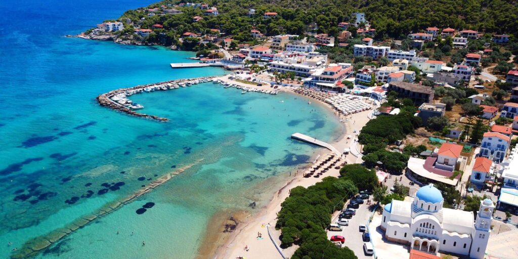 Agistri’s other major village, Skala, is approximately a mile away. It is attuned to the singles scene and has many shops, restaurants and bars that offer a change from the relative quiet of Milos. Although there is a small bus that operates between the two villages, the walk is pleasant on either the inland road or the beach road.