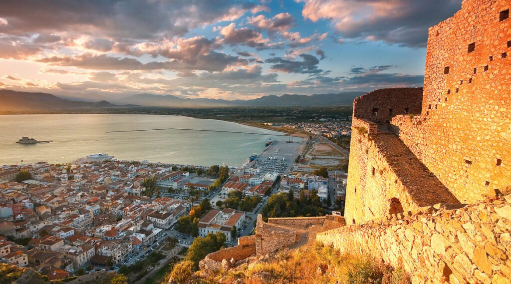 Nauplio: (10,609 inhab.) Nauplio, the first capital of liberated Greece (from 1829-1834), has a great little town square and some good restaurants, as well as a decent, small archaeological museum. The museum is located on the second floor of a Venetian arsenal and houses items from Mycenae, Tiryns, Dendra, Asine, Halieis, and of course Nauplio, which served as the naval base of the Argives in archaic and classical times. Some of the more notable items include a bronze cuirass and a helmet made of boars’ tusks – not matching, and numerous pottery displays (including the clay figurine depicted here). The Castle of Palamidi at Nauplio is quite high but worth the climb once you get to the top (999 steps!). It looks impregnable, and it was designed by LaSalle in 1711, but in battle it fell after only an eight day seige.