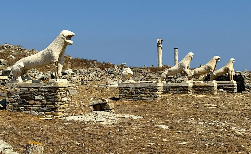 The marble lions dedicated to Apollo by the Naxians at the end of 7th century B.C. stand in a row facing eastwards, towards the Sacred Lake. They are reckoned originally to have been sixteen in number, but only five lions and the remains of three more, standing on modern bases, can be seen in position today. The headless body of another lion now decorates the Arsenal in Venice. Bordering the west side of the road leading from the harbour in Skardana bay to the temples, they were the eternal guardians of the Sanctuary.